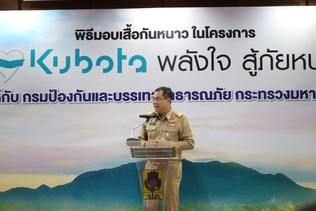 นายเชษฐา โมสิกรัตน์ อธิบดีกรมป้องกันและบรรเทาสาธารณภัย หรือ ปภ. กล่าวถึงภารกิจของกรมฯ ว่า “ในนามของกรมป้องกันและบรรเทาสาธารณภัย รู้สึกยินดีและภาคภูมิใจที่ได้ร่วมเป็นส่วนหนึ่งของโครงการ “คูโบต้าพลังใจสู้ภัยหนาว” ร่วมกับ สยามคูโบต้า ต่อเนื่องยาวนานถึง 6 ปี เพื่อสนับสนุนภารกิจ การบรรเทาสาธารณภัย และช่วยเหลือประชาชนผู้ประสบภัยหนาวในพื้นที่ภาคเหนือ ขณะนี้หลายพื้นที่ในจังหวัด เริ่มมีสภาพภูมิอากาศหนาวเย็นด้วยอุณหภูมิที่ลดลงเนื่องจากเข้าสู่ฤดูหนาว ซึ่งยังมีพี่น้องประชาชนจำนวนมากยังประสบปัญหาขาดแคลนเครื่องนุ่งห่มกันหนาว กรมป้องกันและบรรเทาสาธารณภัยมุ่งเน้นการลดความเสี่ยง ช่วยเหลือผู้ประสบภัยอย่างทันท่วงที และทำงานเชิงรุกเพื่อให้ประชาชนทุกพื้นที่ปลอดภัย โดยเฉพาะการดูแลผู้เปราะบางในช่วงฤดูหนาว ผ่านการสนับสนุนอุปกรณ์ป้องกันภัยและการบูรณาการร่วมกับทุกภาคส่วน”