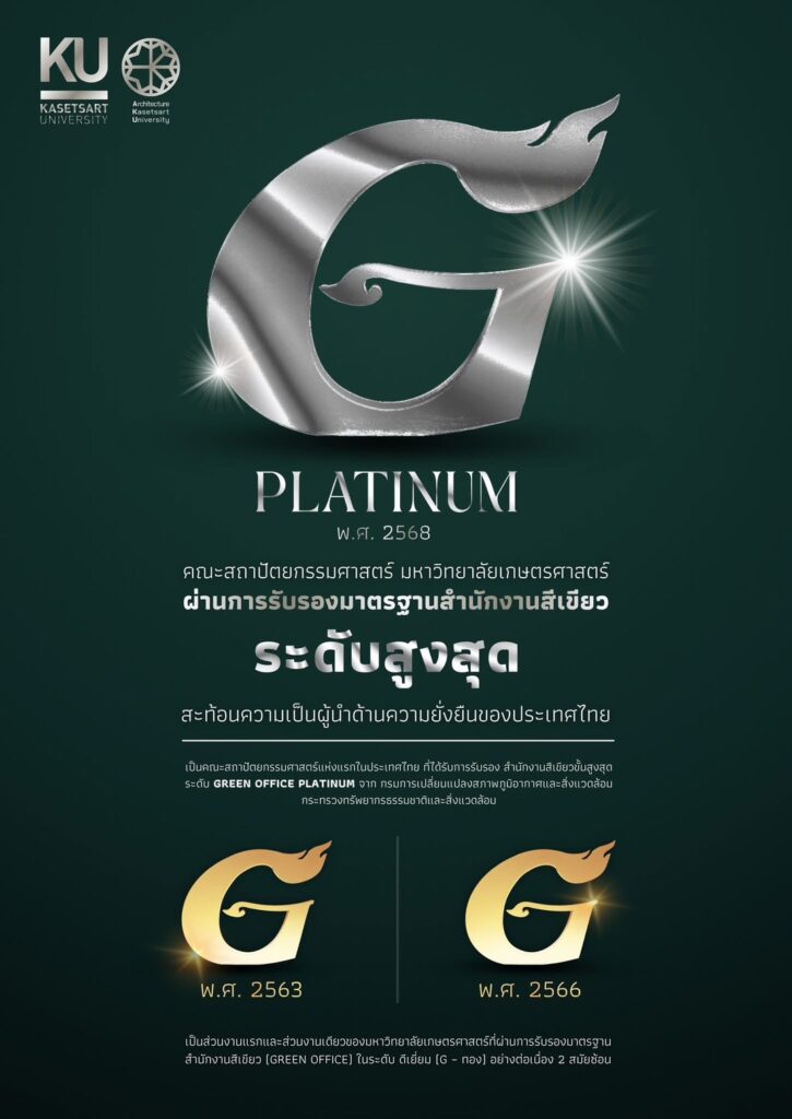 เส้นทางแห่งความสำเร็จต่อเนื่อง คณะสถาปัตยกรรมศาสตร์ มหาวิทยาลัยเกษตรศาสตร์ เป็น ส่วนงานแรกและส่วนงานเดียวของมหาวิทยาลัยเกษตรศาสตร์ ที่ผ่านการรับรองมาตรฐานสำนักงานสีเขียว (Green Office) ระดับดีเยี่ยม (Gold) อย่างต่อเนื่อง 2 สมัยซ้อน ในปี พ.ศ. 2563 และ พ.ศ. 2566 ก่อนจะก้าวสู่ระดับ Platinum ในปี พ.ศ. 2568 ซึ่ง คณะสถาปัตยกรรมศาสตร์ มหาวิทยาลัยเกษตรศาสตร์ ยังเป็น หนึ่งในสามหน่วยงานแรก ในระดับประเทศที่ได้รับรางวัลสูงสุดนี้