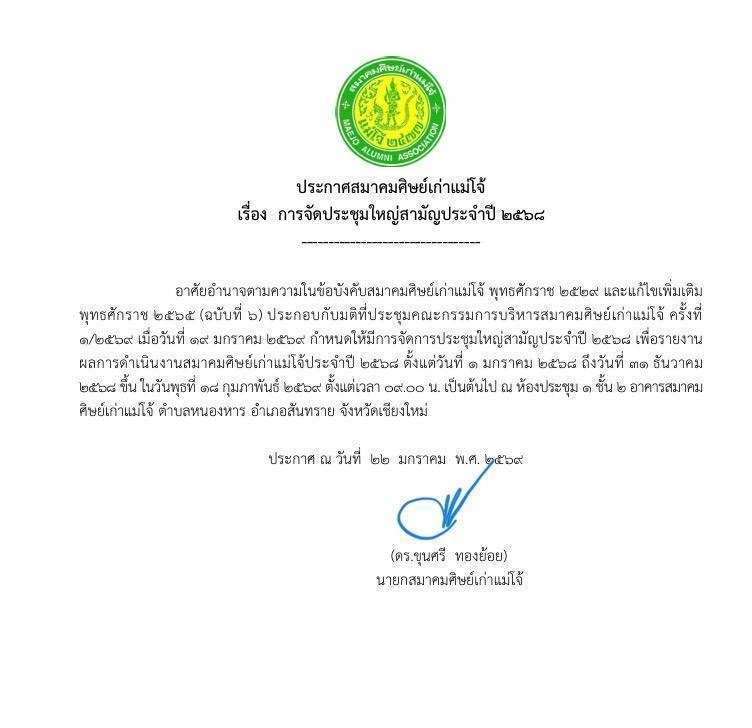 ทั้งนี้สมาคมฯ จะได้มีการประชุมใหญ่สามัญประจำปี วันที่ 18 กุมภาพันธ์ 2569 ตั้งแต่เวลา09.00 น. ณห้องประชุม1 ชั้น2 สมาคมศิษย์เก่าแม่โจ้ จ.เชียงใหม่ การประชุมครั้งนี้จึงไม่เพียงเป็นการประชุมตามวาระของสมาคมเท่านั้น หากแต่เป็นเวทีสำคัญในการรวมพลังศิษย์เก่าแม่โจ้ทุกยุคทุกสมัย เพื่อร่วมกันสานต่ออุดมการณ์แห่งความเป็นแม่โจ้ และขับเคลื่อนบทบาทของสมาคมให้เป็นพลังสำคัญในการพัฒนาการศึกษา เกษตรกรรม และสังคมไทยอย่างยั่งยืนสืบไป