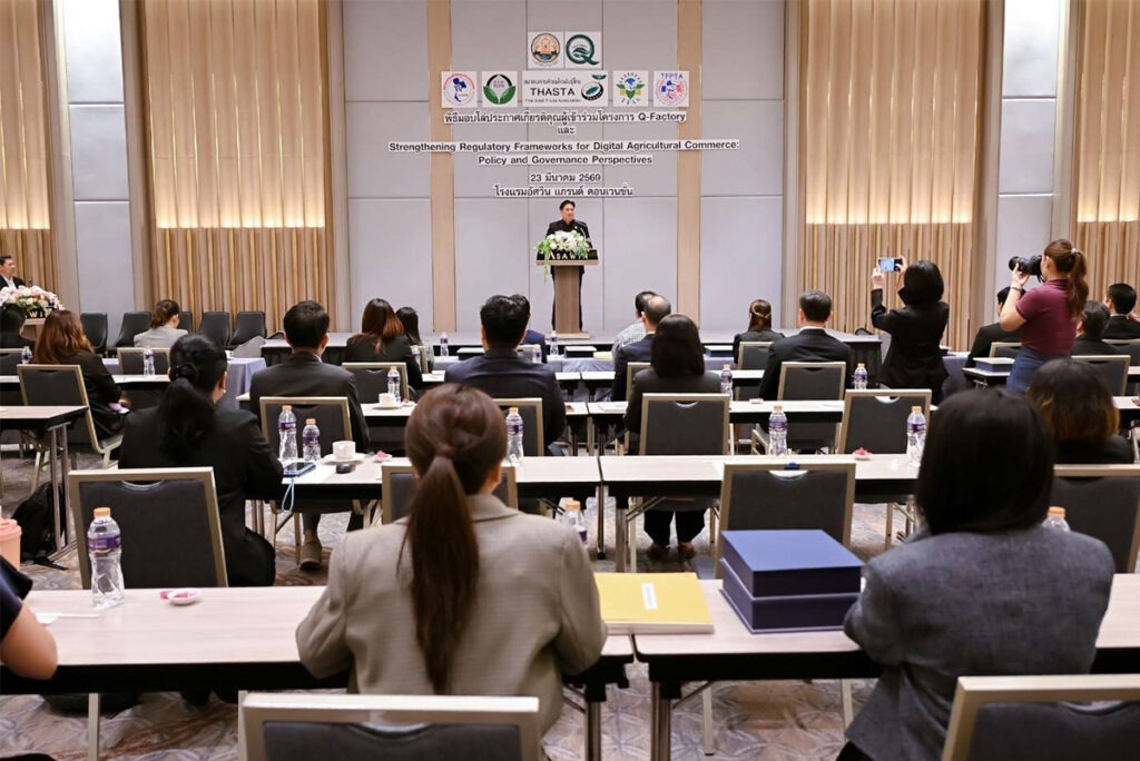 วันที่ 23 มีนาคม 2569 นายรพีภัทร์ จันทรศรีวงศ์ อธิบดีกรมวิชาการเกษตร เป็นประธานเปิดการเสวนาเรื่อง “การเสริมสร้างกรอบการกำกับดูแลการค้าสินค้าเกษตรดิจิทัล: มุมมองเชิงนโยบายและหลักธรรมาภิบาล” พร้อมมอบโล่ประกาศเกียรติคุณแก่ผู้ประกอบการในโครงการ Q-FACTORY ประจำปี 2568 ณ โรงแรมอัศวิน แกรนด์ คอนเวนชั่น กรุงเทพมหานคร โดยมีผู้บริหารจากหน่วยงานภาครัฐ ภาคเอกชน และภาคีเครือข่ายที่เกี่ยวข้องเข้าร่วมอย่างคับคั่ง