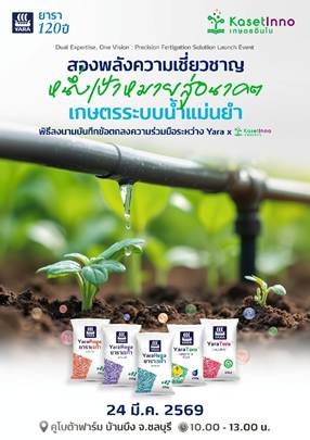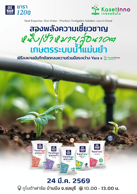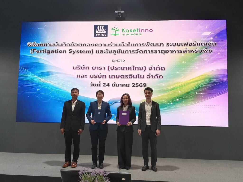 24 มีนาคม 2569 – บริษัทยารา ผู้นำระดับโลกด้านธาตุอาหารพืชจากประเทศนอร์เวย์ ร่วมกับบริษัทเกษตรอินโน ผู้เชี่ยวชาญด้านโซลูชันฟาร์มครบวงจร ลงนามบันทึกความเข้าใจ (MOU) เพื่อพัฒนาระบบให้ปุ๋ยผ่านน้ำ (Fertigation) ที่ผสานองค์ความรู้ด้านโภชนาการพืชเข้ากับความเชี่ยวชาญด้านวิศวกรรมอย่างมีประสิทธิภาพ มุ่งยกระดับเกษตรสมัยใหม่ของไทยให้ก้าวหน้า เข้าถึงง่าย และตอบโจทย์เกษตรกรทุกระดับ