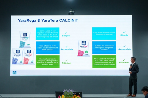คุณนันทิยา พิทักษ์วงษ์ดีงาม กรรมการผู้จัดการ บริษัทยารา (ประเทศไทย) จำกัด เล่าว่า “การเกษตรแม่นยำเป็นปัจจัยสำคัญเพื่อความอยู่รอด  ยารามุ่งพัฒนาโซลูชันการให้ปุ๋ยผ่านระบบน้ำ หรือ fertigation เพื่อช่วยเพิ่มผลผลิตและใช้ทรัพยากรอย่างคุ้มค่า ทั้งนี้ ยาราเชี่ยวชาญด้านธาตุอาหารพืช และมีผลิตภัณฑ์สำหรับระบบน้ำอย่าง YaraRega