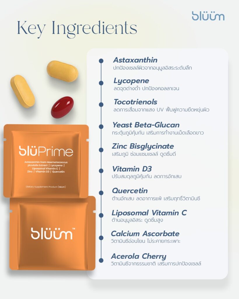 - ทานผลิตภัณฑ์เสริมอาหารที่ช่วยดูแลผิวพรรณและเสริมสร้างภูมิคุ้มกัน ก็เป็นอีกหนึ่งวิธีที่สำคัญเช่นกัน อย่าง blüüm แบรนด์ผลิตภัณฑ์เสริมอาหารจาก Betagro Ventures บริษัทด้านการลงทุนและพัฒนานวัตกรรมในอุตสาหกรรมเกษตรและอาหาร ภายใต้ บริษัท เบทาโกร จำกัด (มหาชน) หรือ BTG บริษัทอาหารครบวงจรชั้นนำของไทย คิดค้นมาทั้งหมด 4 สูตร ได้แก่ สูตร blüClear สูตร blüFlex สูตร blüNight และ สูตร blüPrime โดยเฉพาะสูตร blüPrime ที่ตอบโจทย์ผู้ที่เผชิญมลภาวะ ความเครียด และแสงแดดในชีวิตประจำวัน ด้วยสารต้านอนุมูลอิสระประสิทธิภาพสูง เช่น แอสต้าแซนธิน (Astaxanthin) ที่ปกป้องเซลล์ผิวจากอนุมูลอิสระระดับลึก ไลโคปีน ที่ช่วยลดจุดด่างดำ ป้องกันคอลลาเจนจากการถูกทำลาย วิตามิน E ในรูปแบบโทโคไตรอีนอล (Tocotrienols) ช่วยลดการเสื่อมของเซลล์ผิวจากแสง UV และช่วยฟื้นฟูความยืดหยุ่นของผิว ยีสต์เบต้ากลูแคน กระตุ้นภูมิคุ้มกัน วิตามิน C ในรูปแบบไลโปโซมอล ซึ่งเป็นรูปแบบที่ดูดซึมได้ดี คงอยู่ในร่างกายได้นาน และอ่อนโยนต่อกระเพาะมากกว่ารูปแบบทั่วไป เป็นต้น ช่วยดูแลผิวพรรณ ควบคู่การเสริมภูมิคุ้มกัน ด้วยจุดเด่นหลักของผลิตภัณฑ์ blüüm ที่สามารถบริโภคได้ครบ จบ ตอบโจทย์อย่างตรงจุด ภายในซองเดียว รวมถึงผสานสารอาหารหลากหลายร่วมกันได้อย่างเหมาะสม ช่วยให้การใช้ชีวิตของทุกคนง่ายขึ้นไปอีกขั้น
